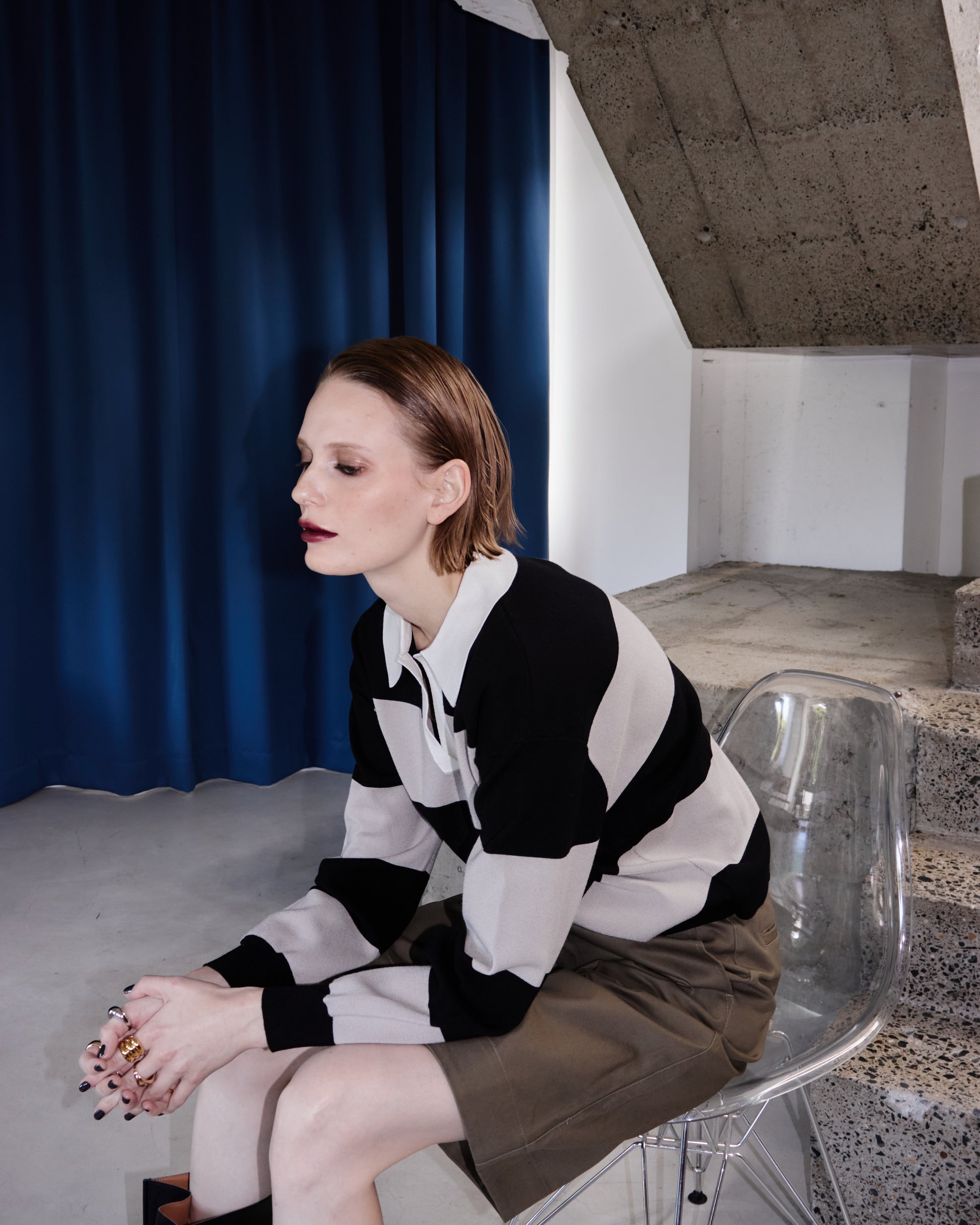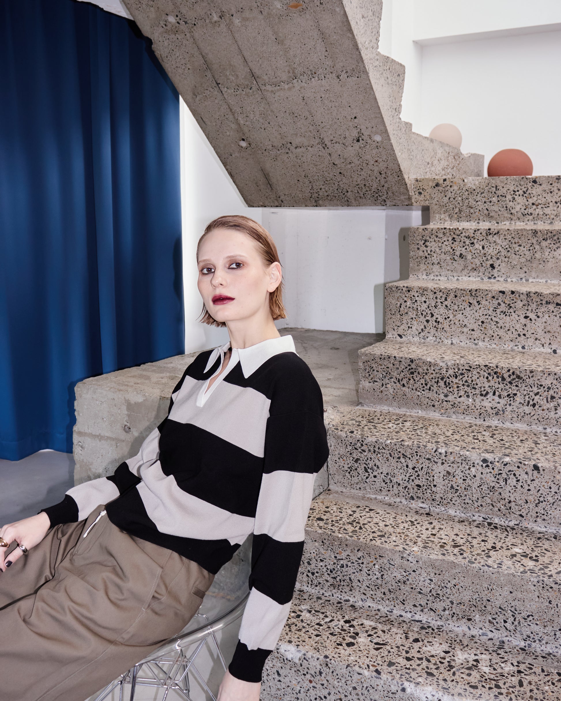 存在感のあるレッド×ネイビーのボーダーに、ホワイトの襟を効かせることで爽やかなコントラストを演出。ほどよくゆとりのあるシルエットが抜け感を与え、スタイリングに取り入れるだけでこなれ感をプラスしてくれます。ワイドパンツやデニムと合わせたストリートライクな着こなしはもちろん、スカートと合わせてプレッピーに仕上げるのもおすすめ。幅広いスタイルに活躍する一枚です。