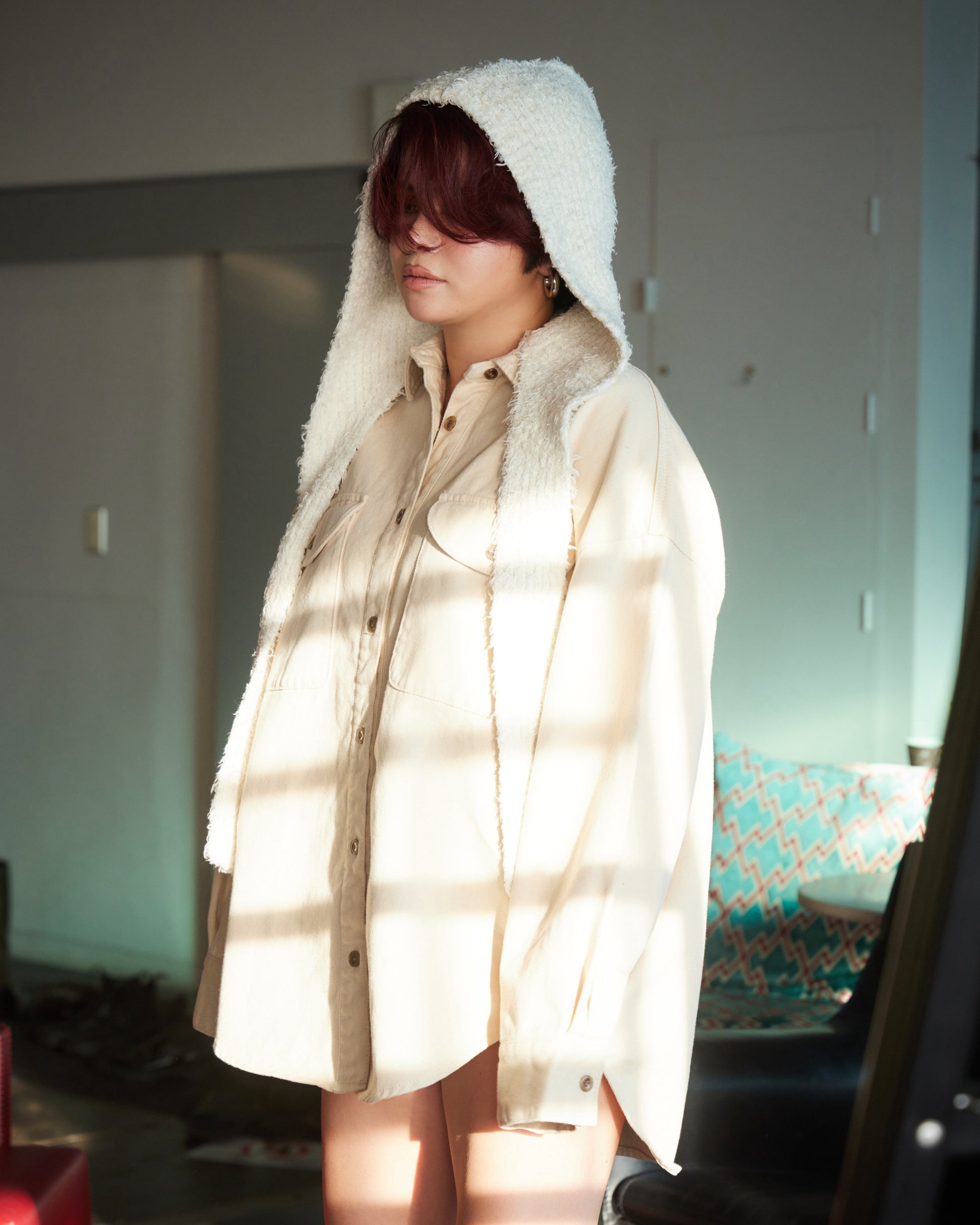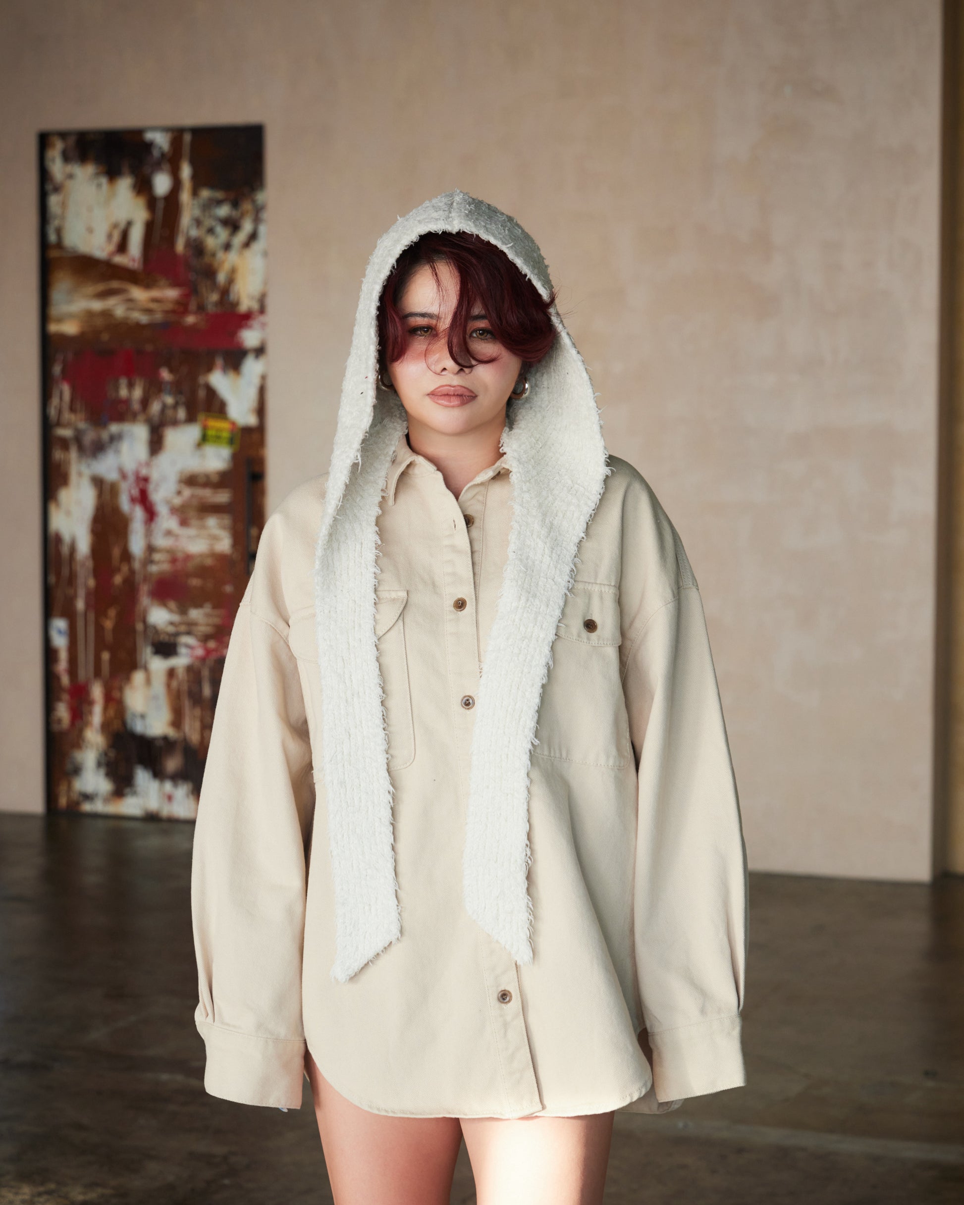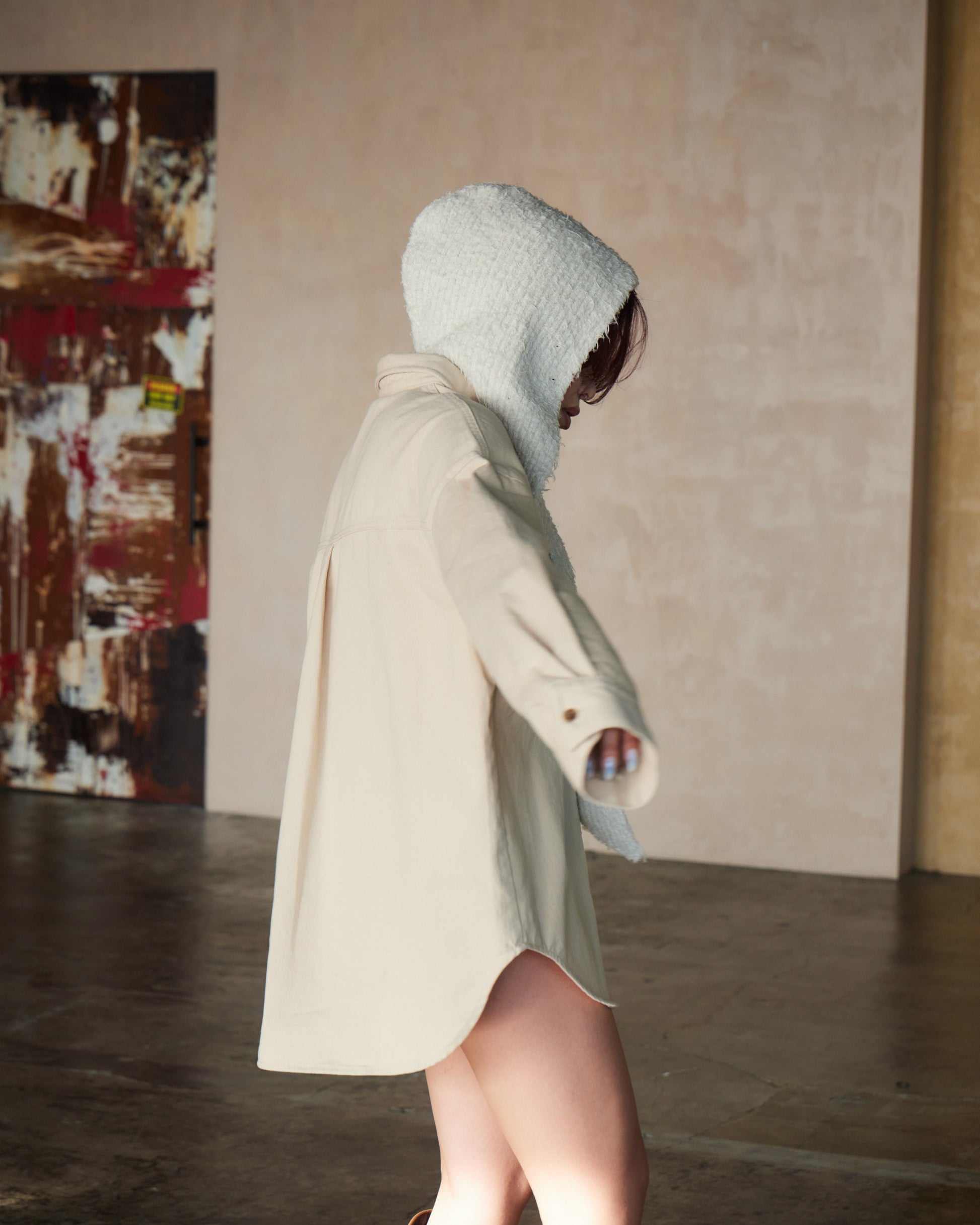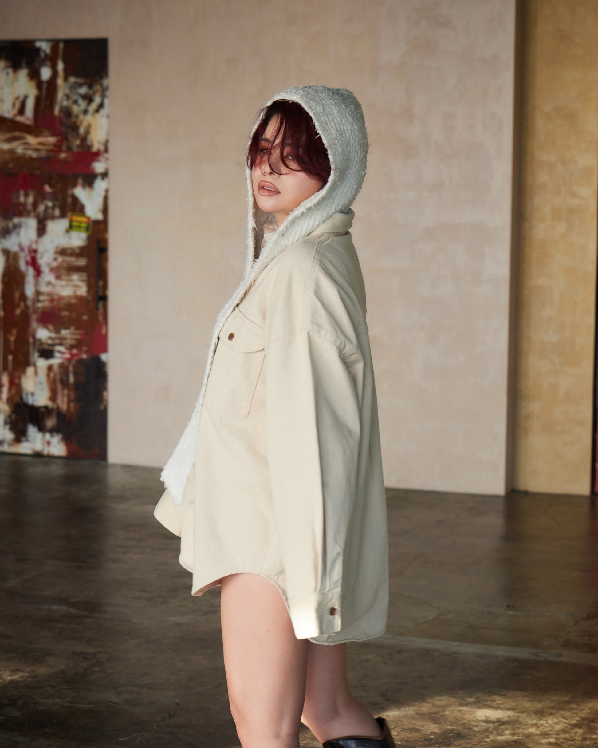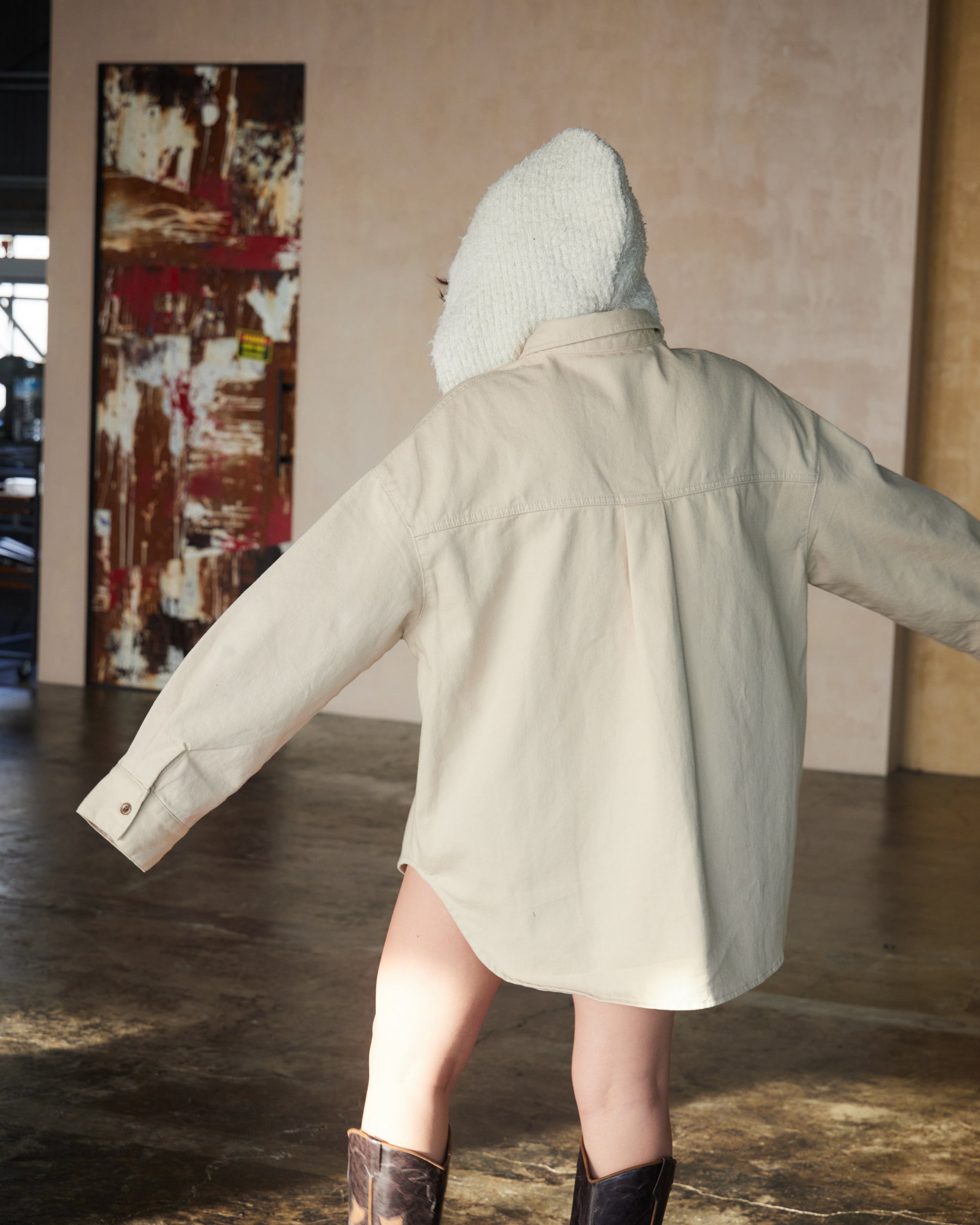 厚みのある生地感がシルエットに立体感を生み、ラフに羽織るだけで存在感のあるスタイルに仕上がります。ワークディテールをベースにしながらも、クリーンなカラーとミニマルなデザインで洗練された印象に。