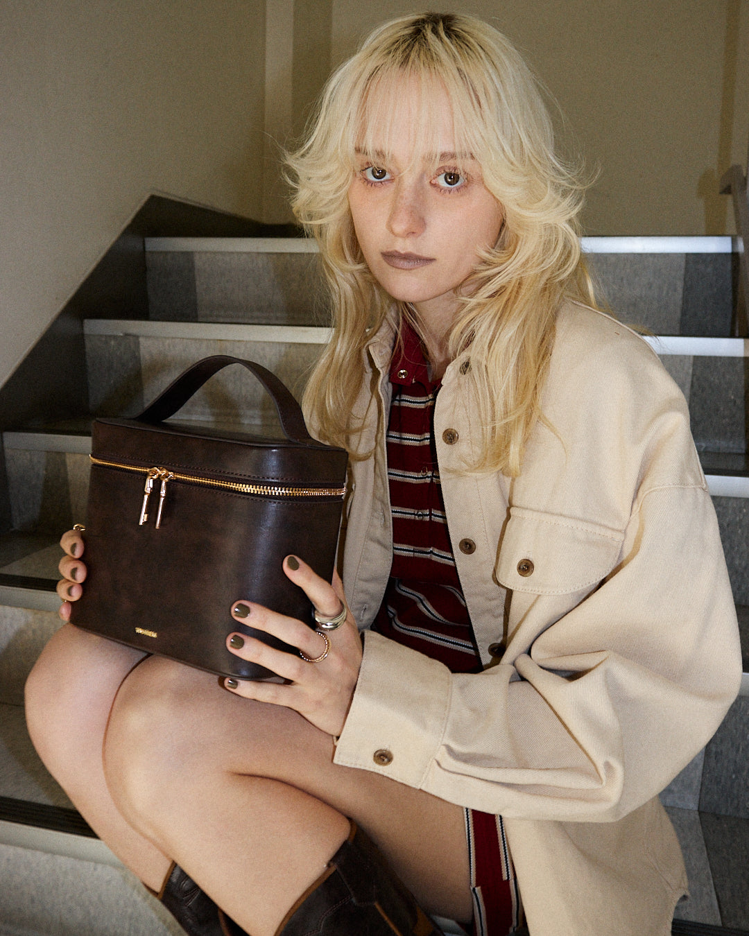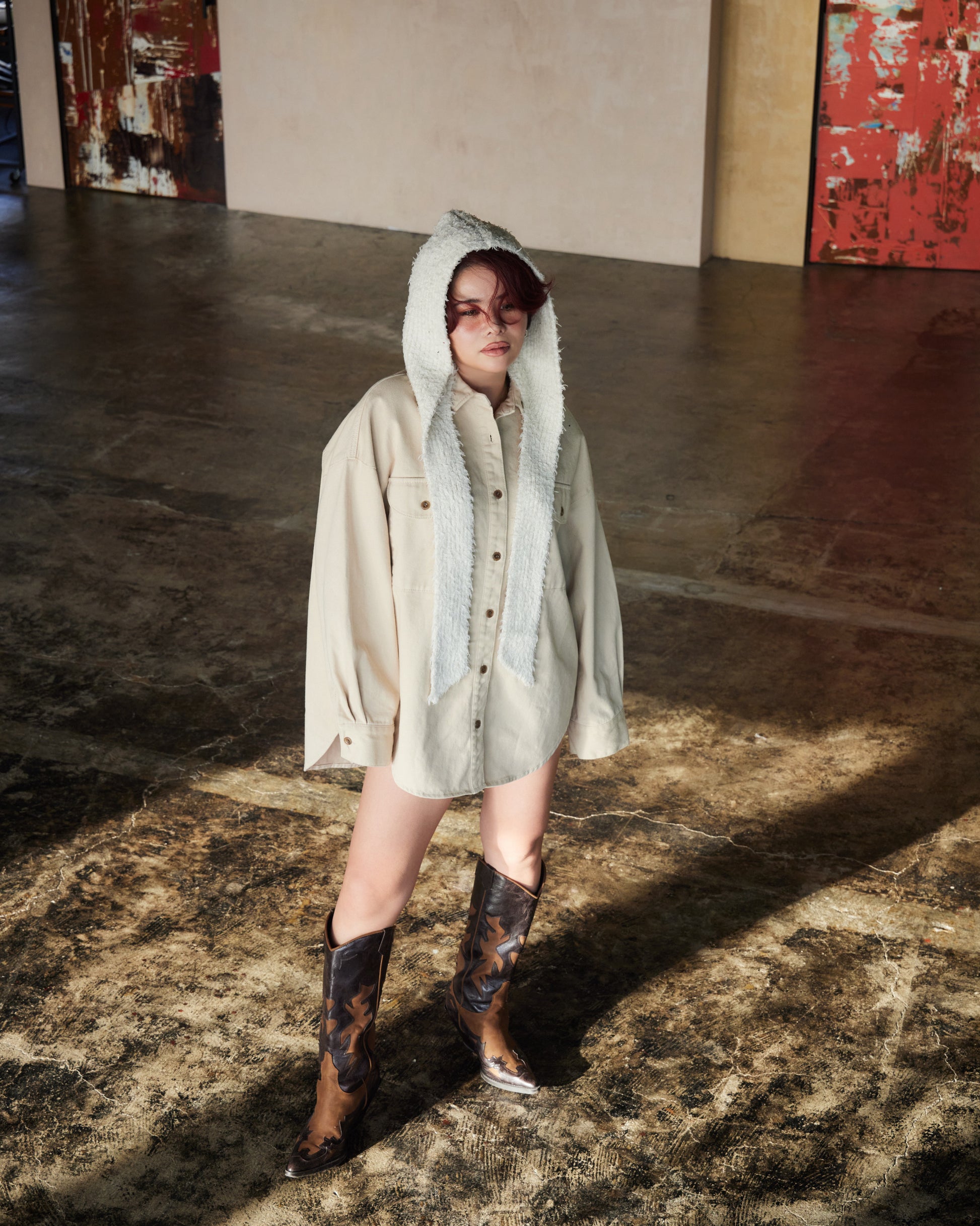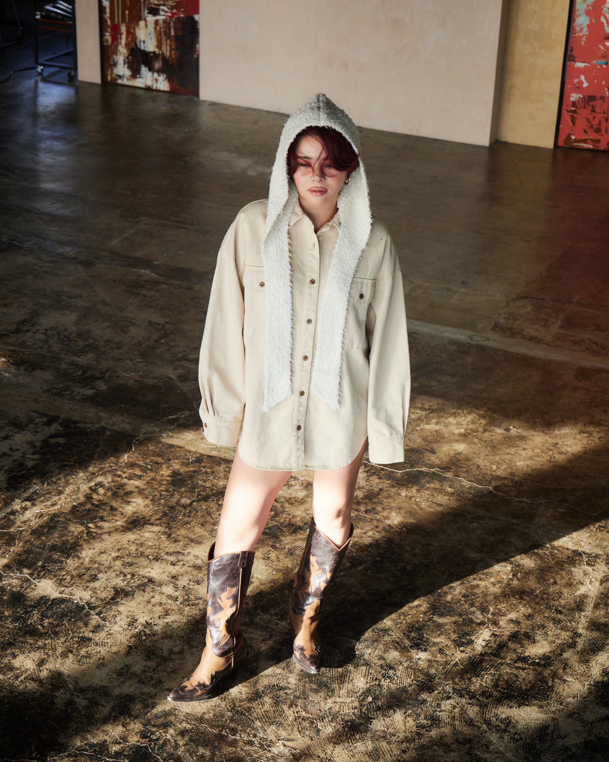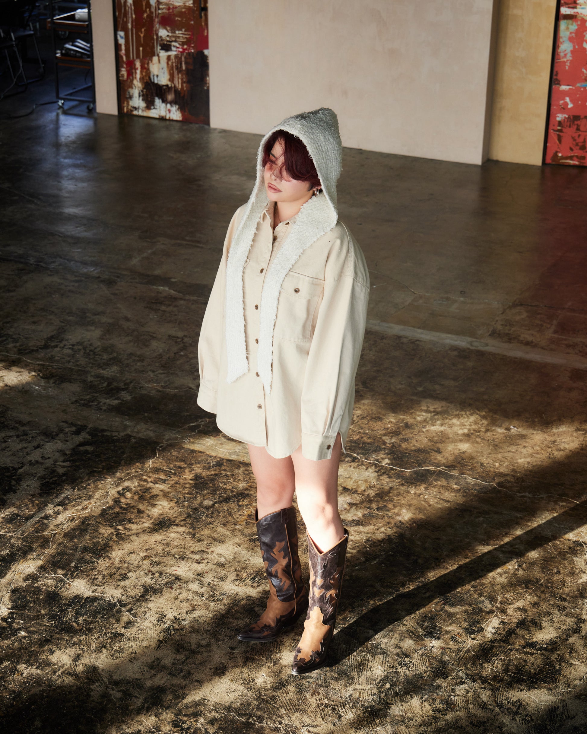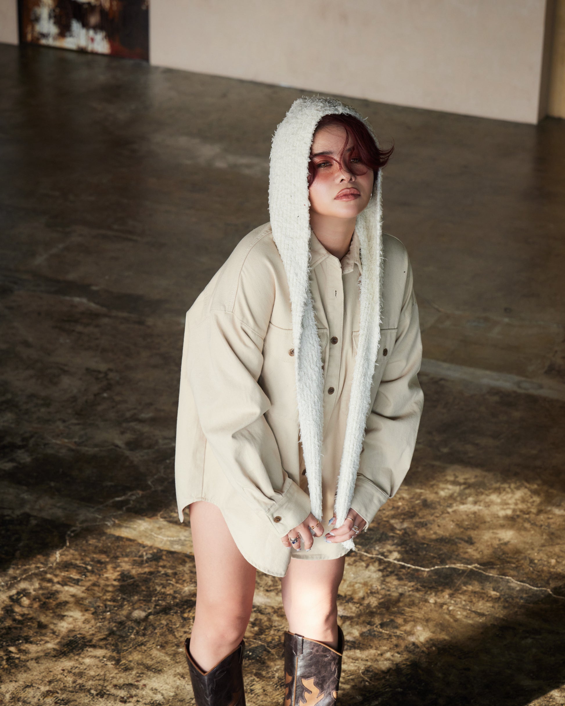 厚みのある生地感がシルエットに立体感を生み、ラフに羽織るだけで存在感のあるスタイルに仕上がります。ワークディテールをベースにしながらも、クリーンなカラーとミニマルなデザインで洗練された印象に。