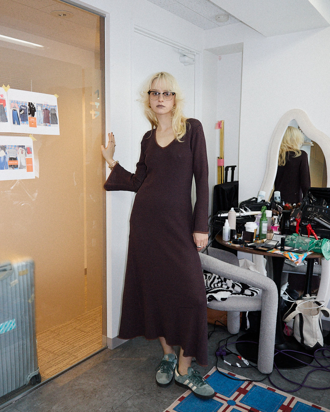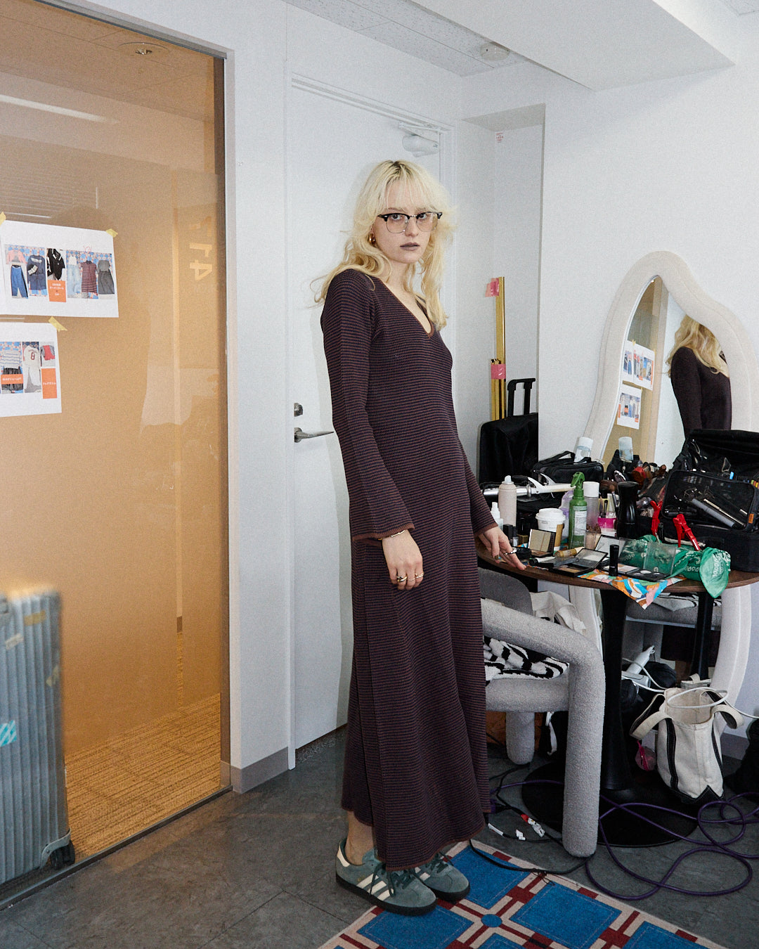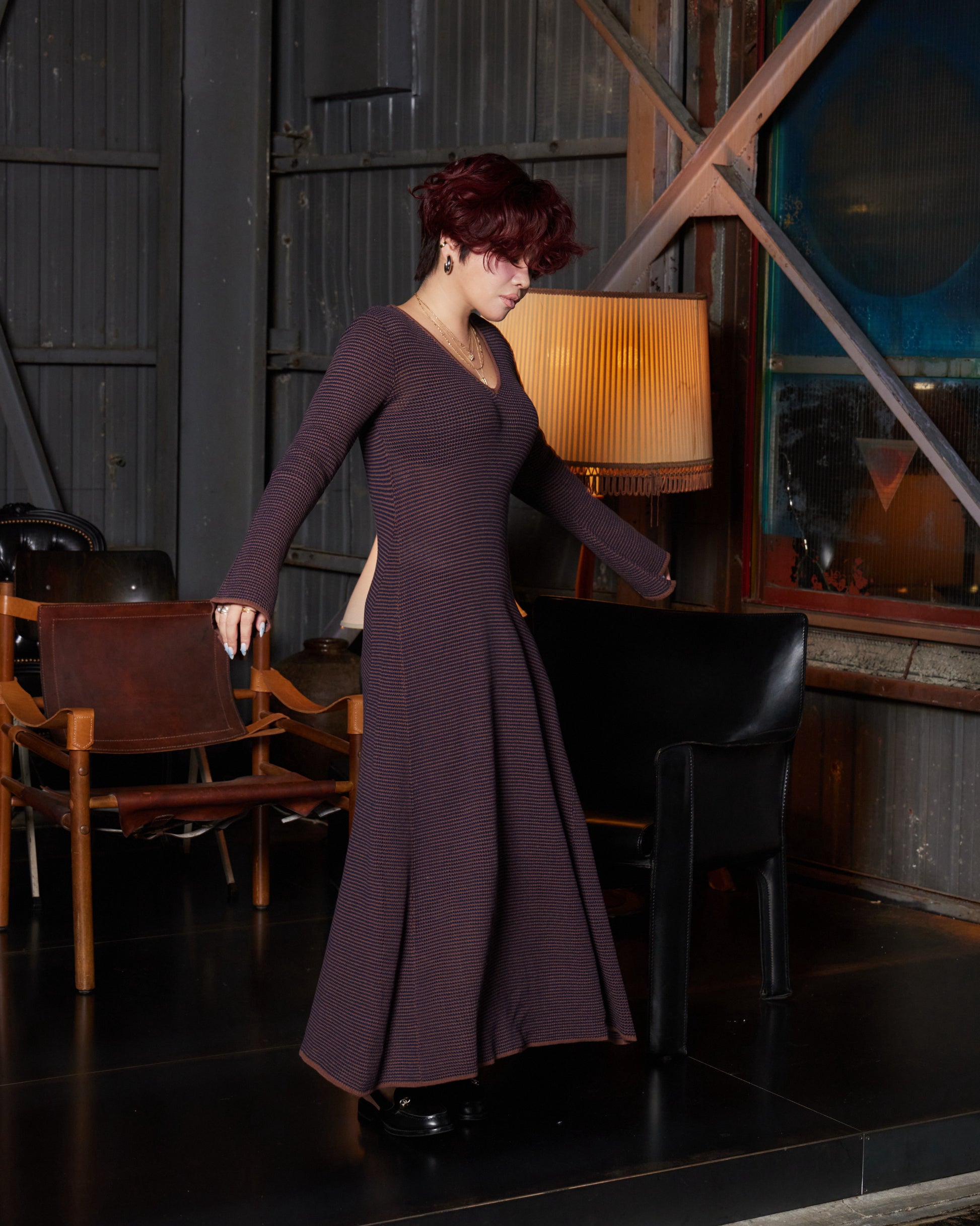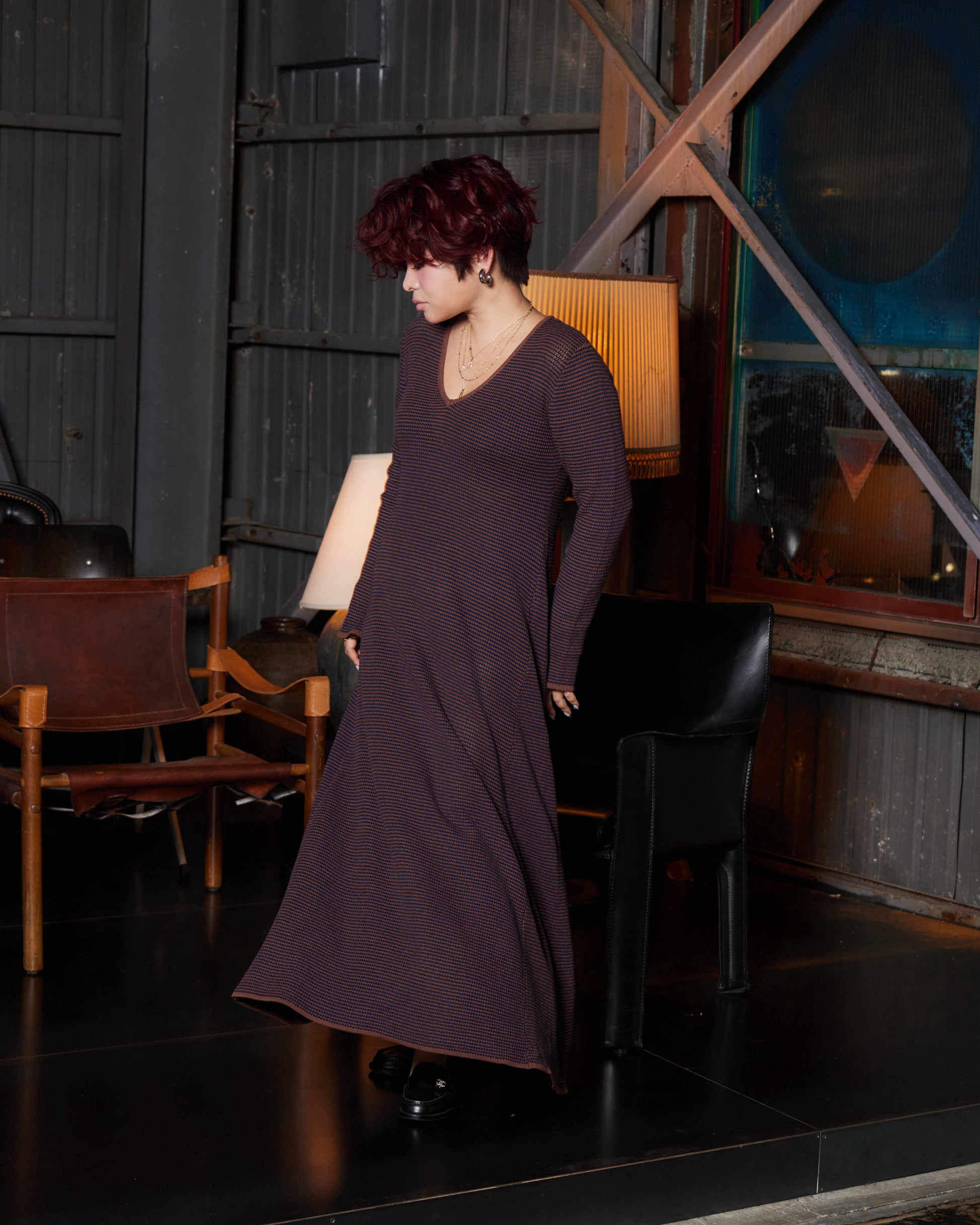 やわらかく身体に沿う、繊細なボーダーのロングワンピース。